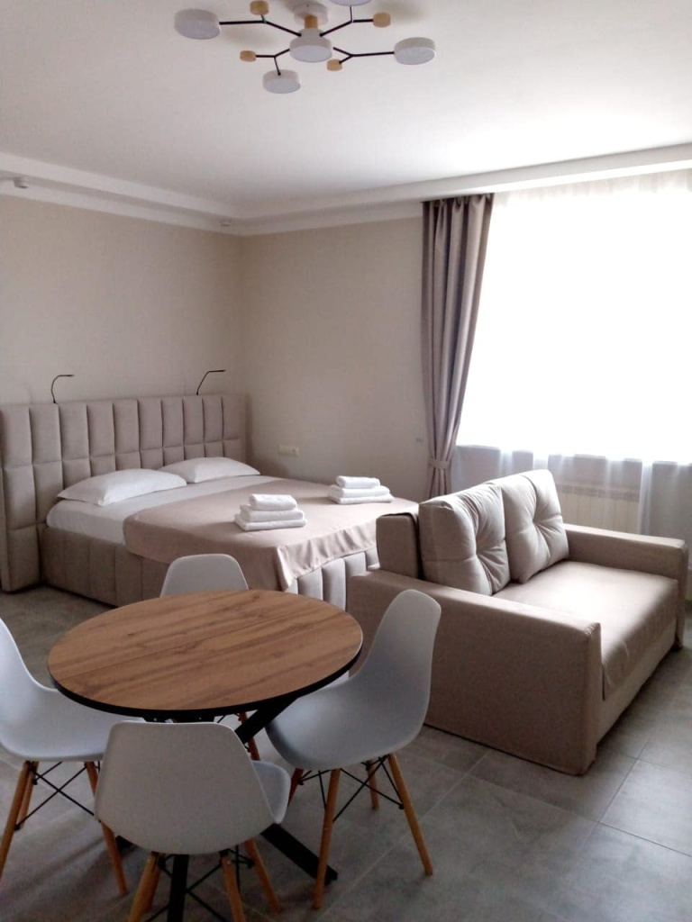 Улучшенный стандарт с отдельным входом и мини-кухней: 1-комнатный номер, мебель, телевизор, кондиционер, холодильник, санузел, кухонная зона (чайник, плита), микроволновая печь, сейф, фен.