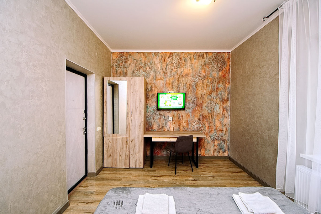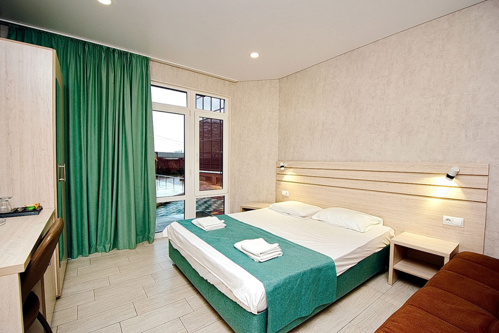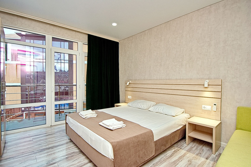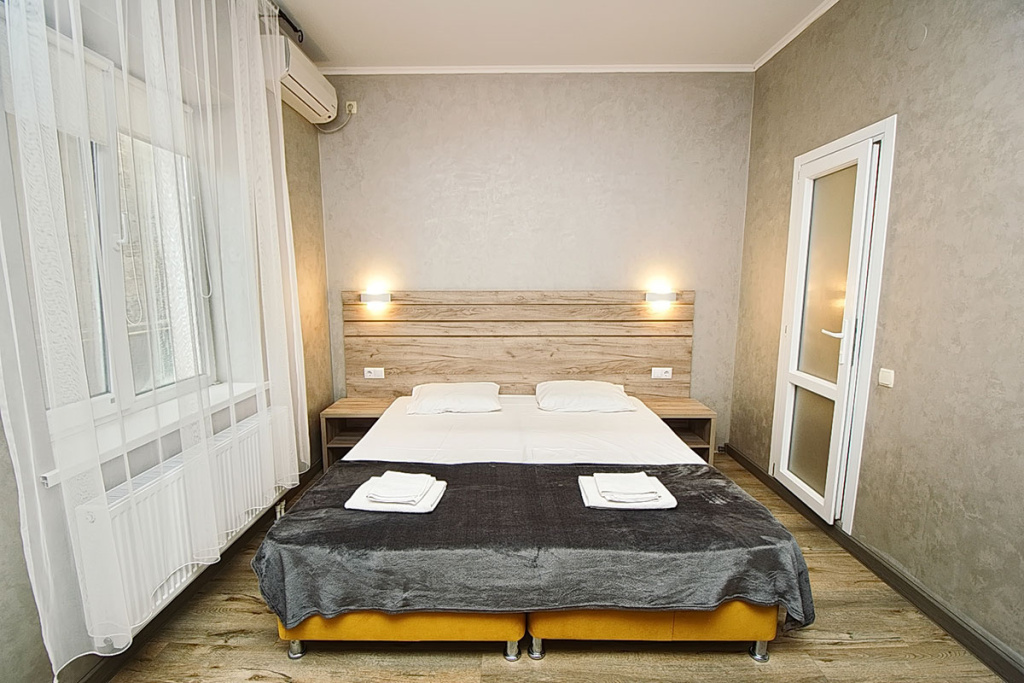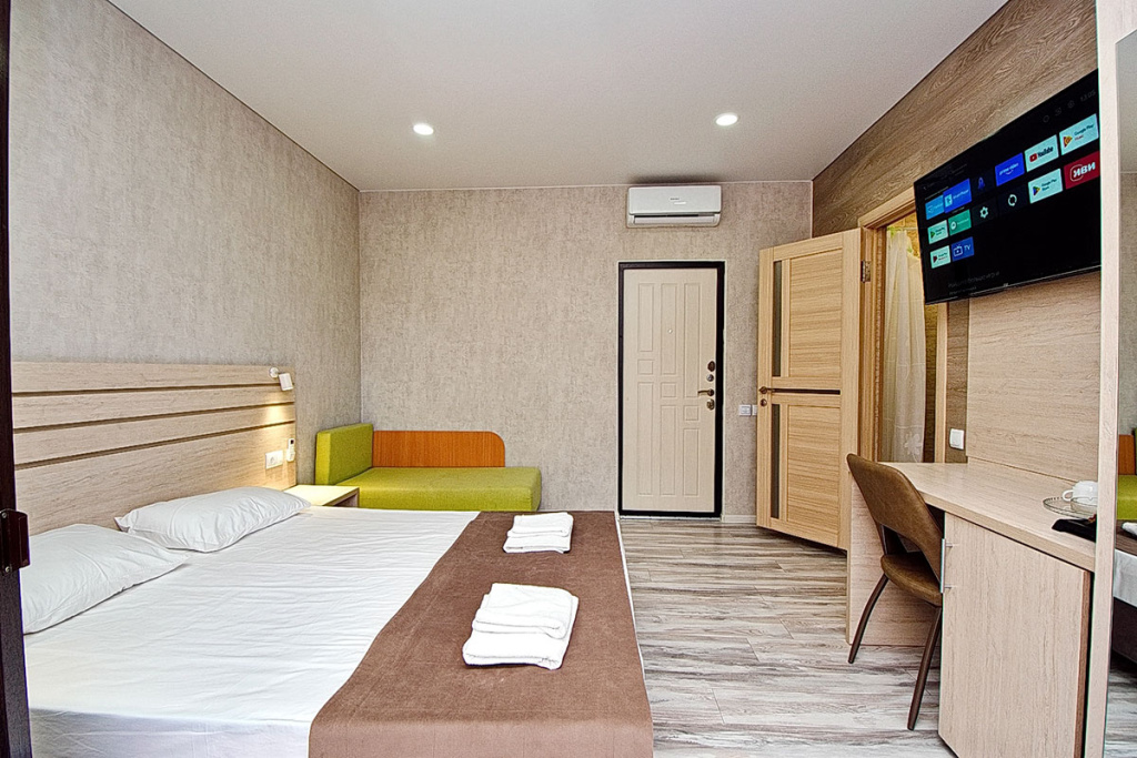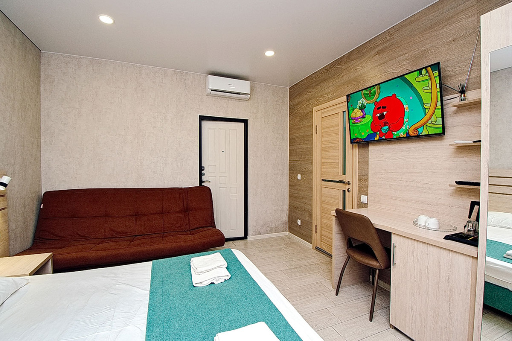 4-местный стандарт: 1-комнатный номер, мебель (2-спальная кровать и 2-спальный диван), телевизор, кондиционер, холодильник, санузел, фен, 18 м.кв.