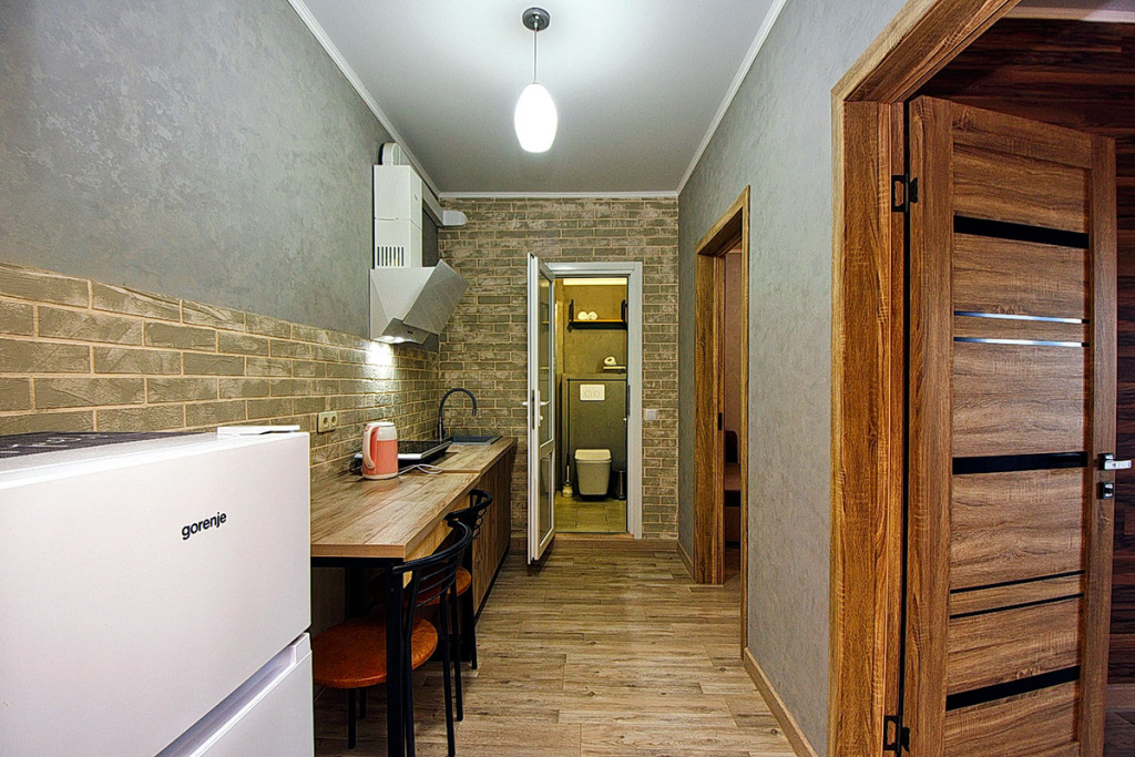 Апартаменты с кухней: 2-комнатный номер, мебель (2-спальная кровать, 1-спальная кровать, 2-спальный диван), телевизор, кондиционер, холодильник, санузел, фен, кухонная зона, балкон, 45 м.кв.