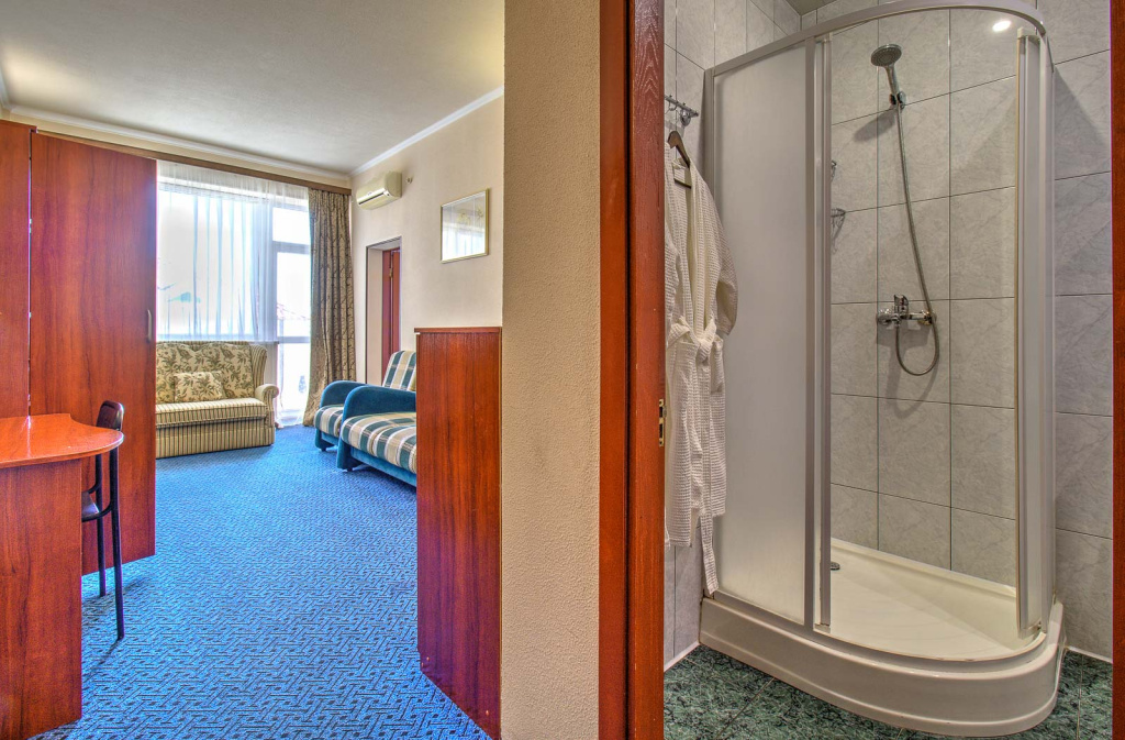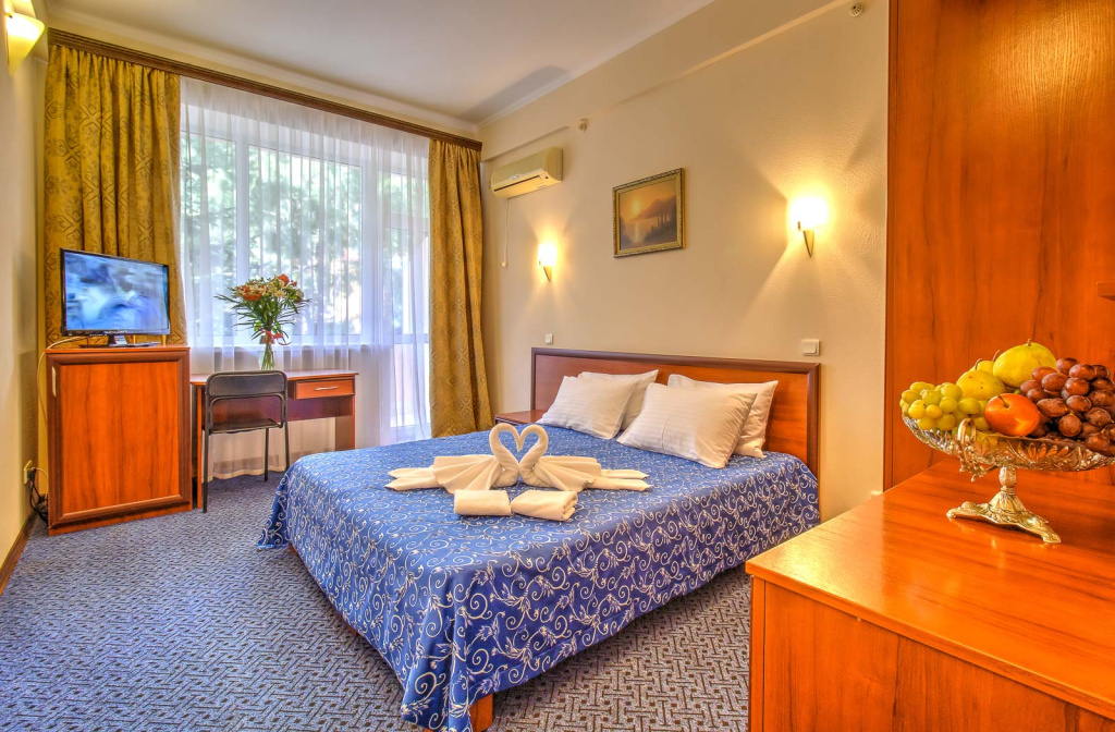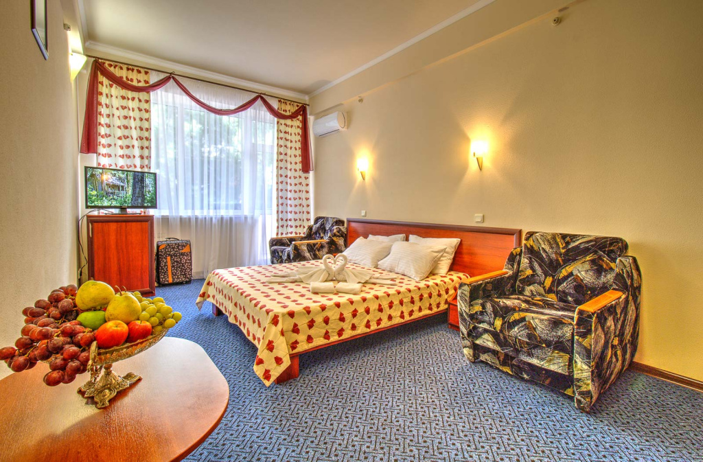 Стандарт Б вид на зеленую зону с балконом: 1-комнатный номер, мебель (2-спальная кровать или две 1-спальные кровати, доп.место - еврораскладушка), кондиционер, санузел, телевизор, холодильник, фен, чайник, 20 кв.м.,1 корпус, 2,4,5,6 этаж, без лифта.Люкс Б 2-комнатный вид на море с балконами: 2-комнатный номер, мебель (2-спальная кровать, доп.место - кресло-кровать), кондиционер, санузел, телевизор, холодильник, фен, чайник, 34 кв.м., 2 балкона, 1 корпус, 3 этаж, без лифта.