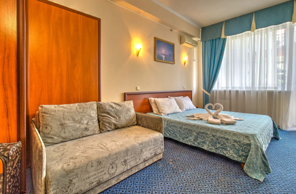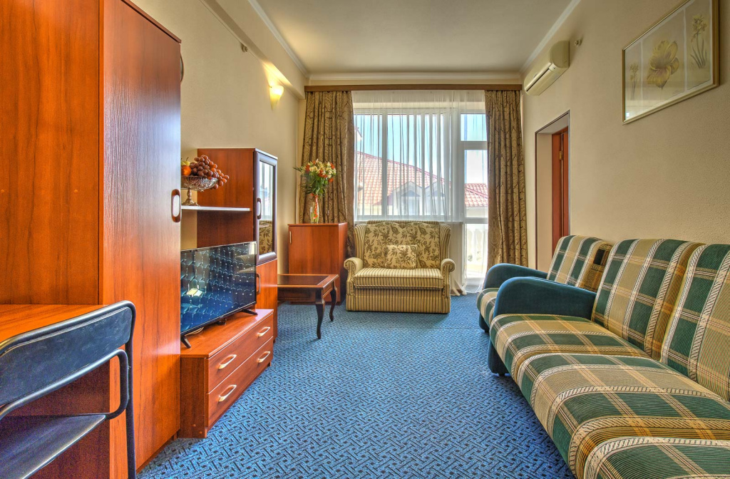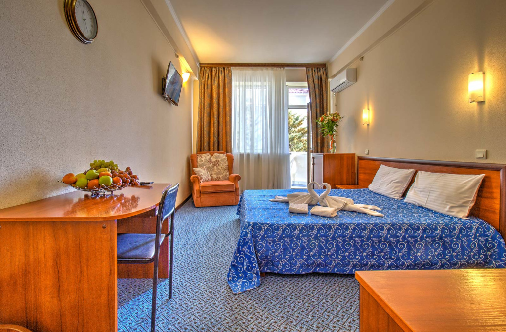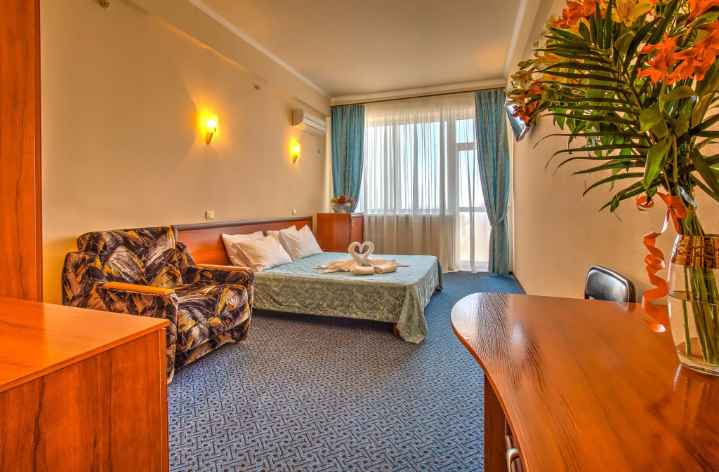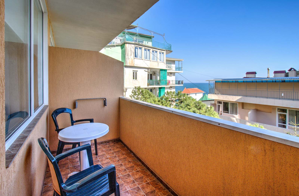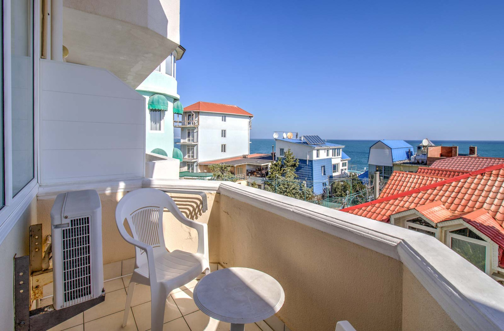 Стандарт вид на море с балконом: 1-комнатный номер, мебель (2-спальная кровать или две 1-спальные кровати, доп.место - кресло-кровать), кондиционер, санузел, телевизор, холодильник, фен, чайник, 1 корпус, 3,4,5,6 этаж, без лифта.