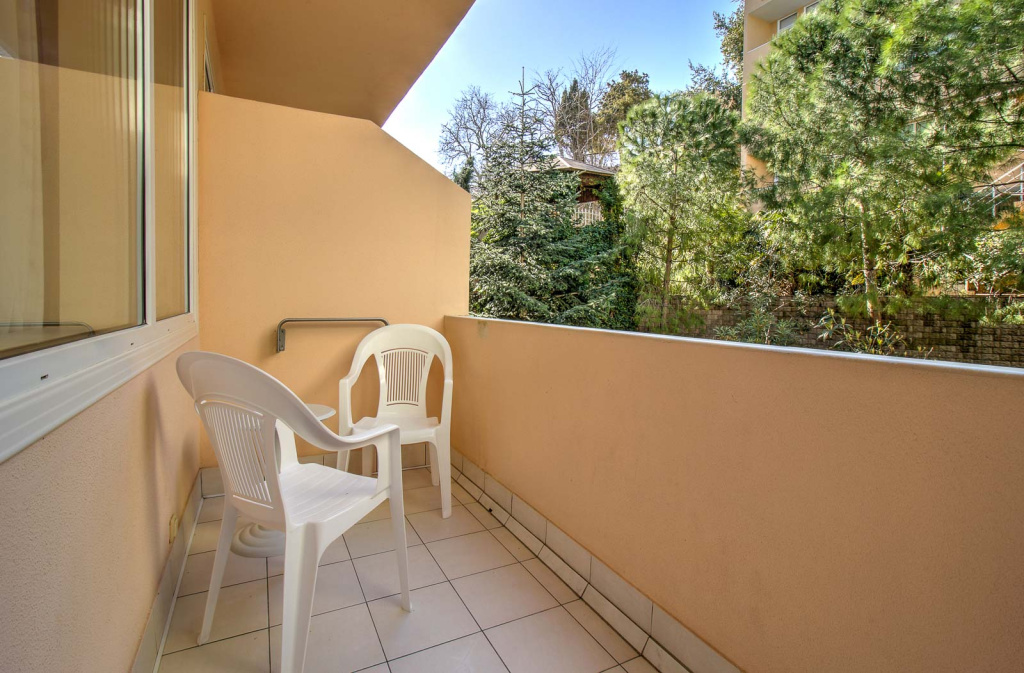 Стандарт А вид на зеленую зону с балконом: 1-комнатный номер, мебель (2-спальная кровать, доп.место - кресло-кровать), кондиционер, санузел, телевизор, холодильник, фен, чайник, 23 кв.м., 1 корпус, 2,5,6 этаж, без лифта.