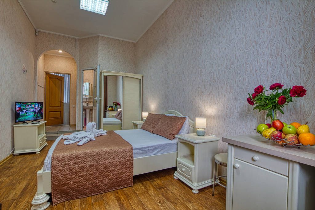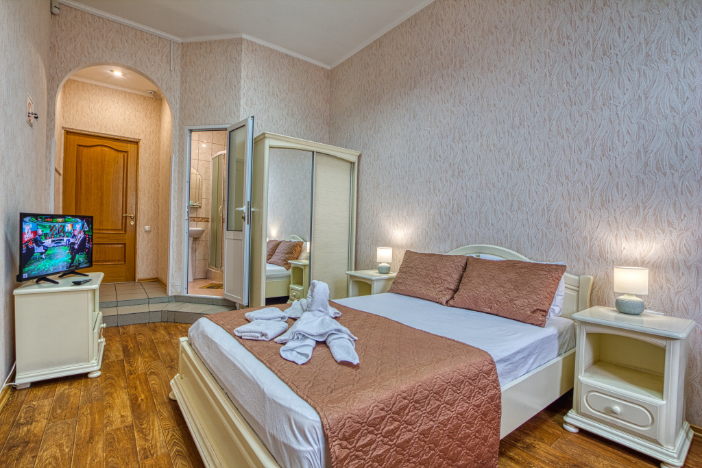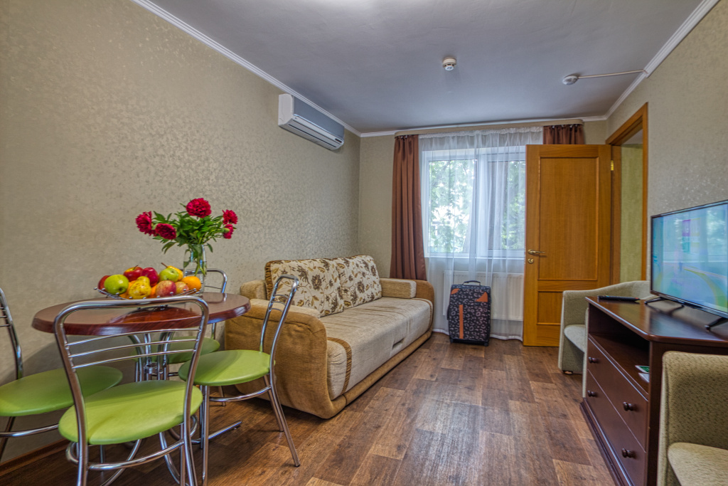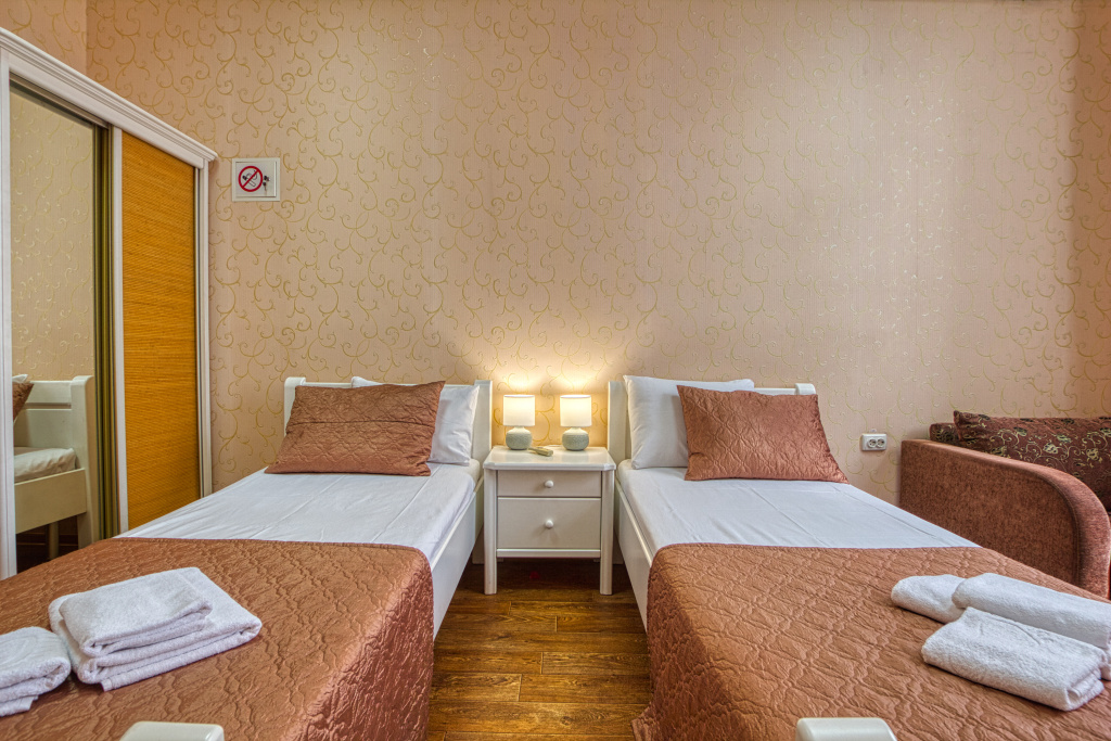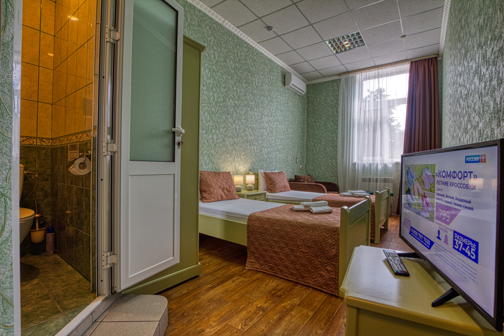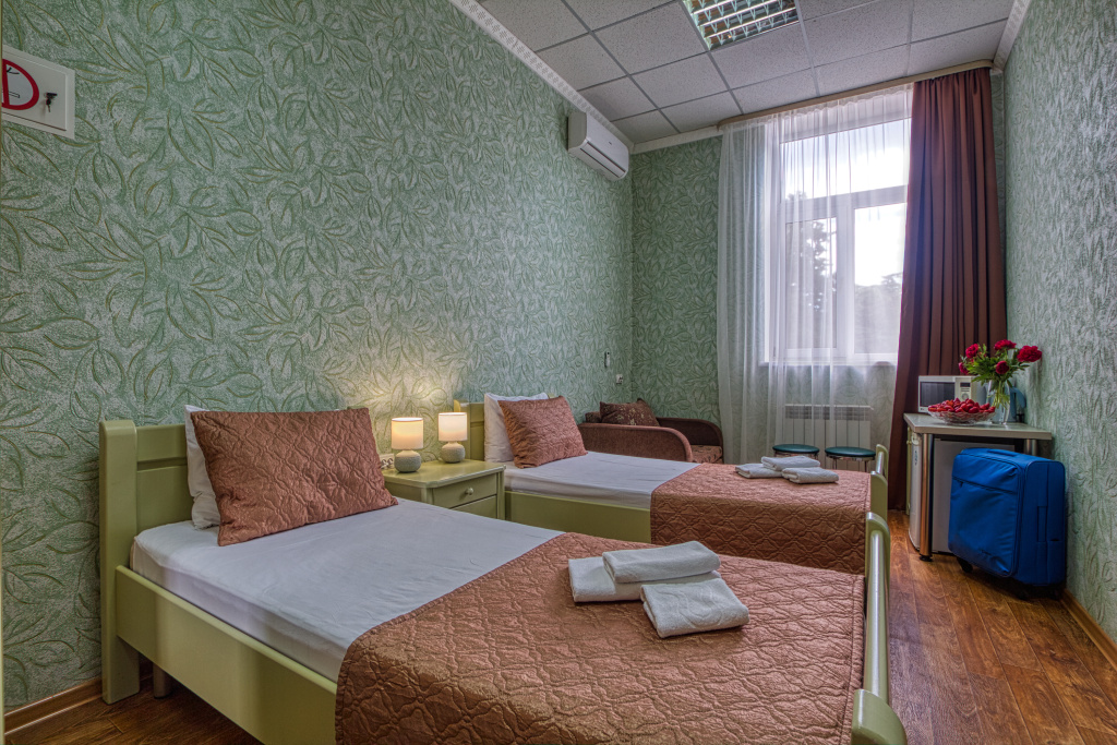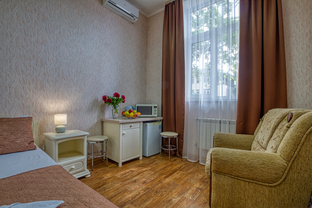 Стандарт: 1-комнатный номер, мебель (две 1-спальные кровати с возможностью их совмещения и раскладное кресло), кондиционер, санузел, телевизор, холодильник, 20 кв.м.