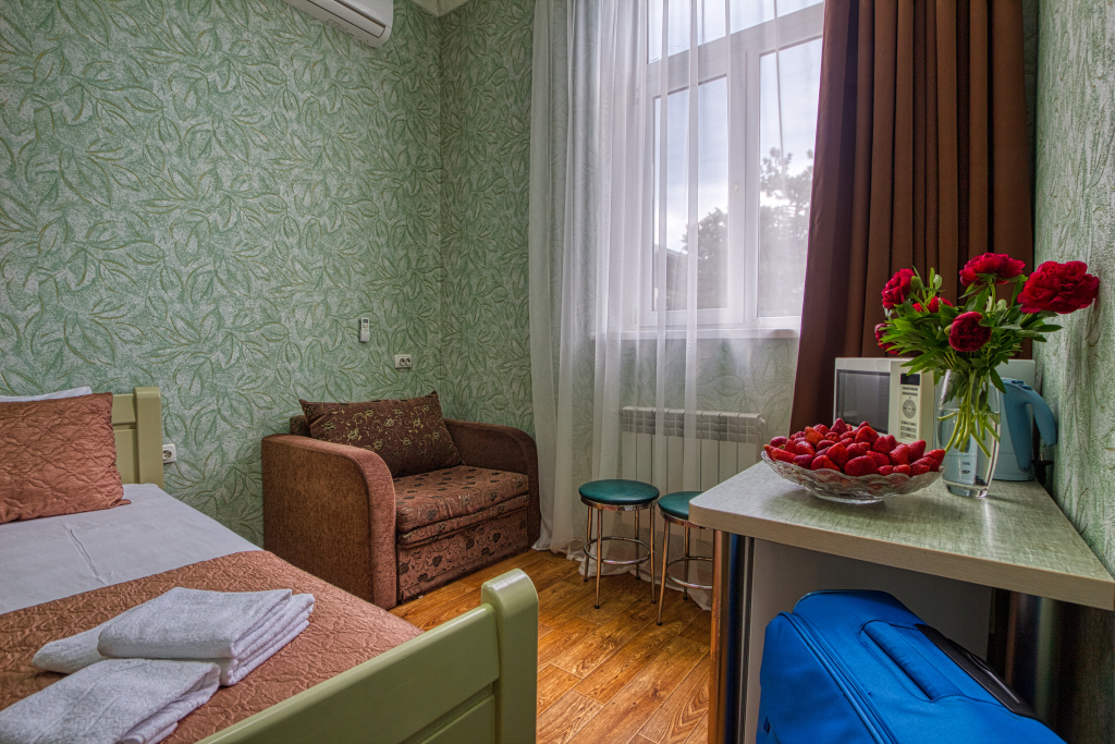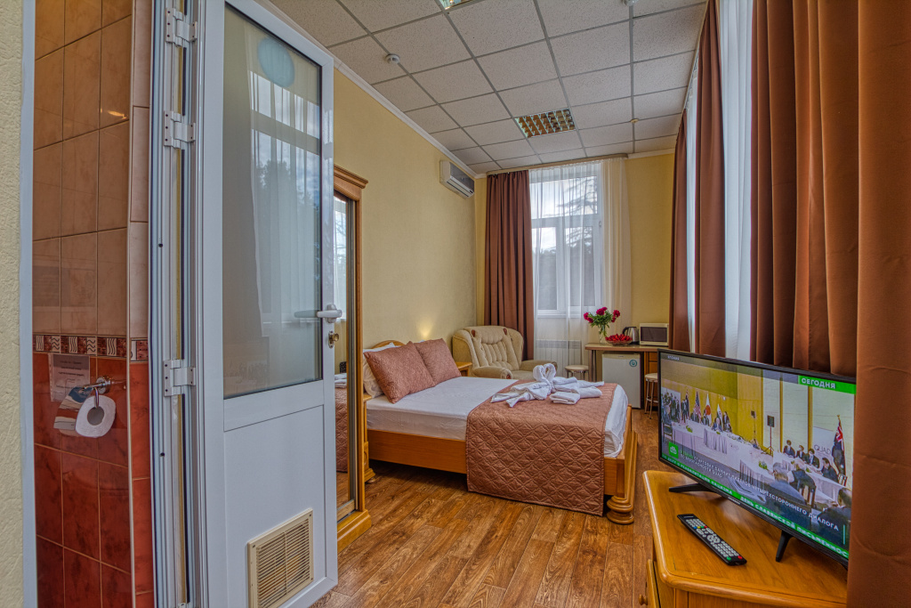 Комфорт: 1-комнатный номер, мебель (2-спальная кровать и раскладное кресло), кондиционер, санузел, телевизор, холодильник, 21,5 кв.м.