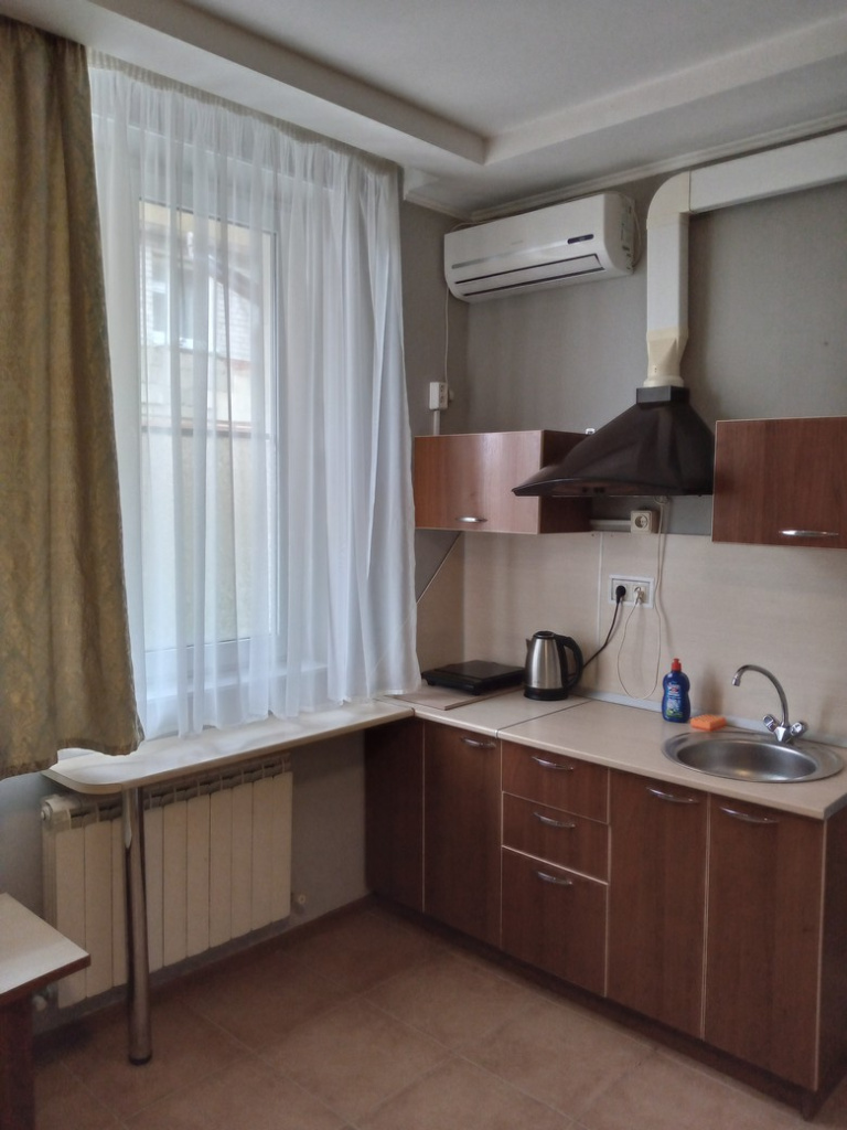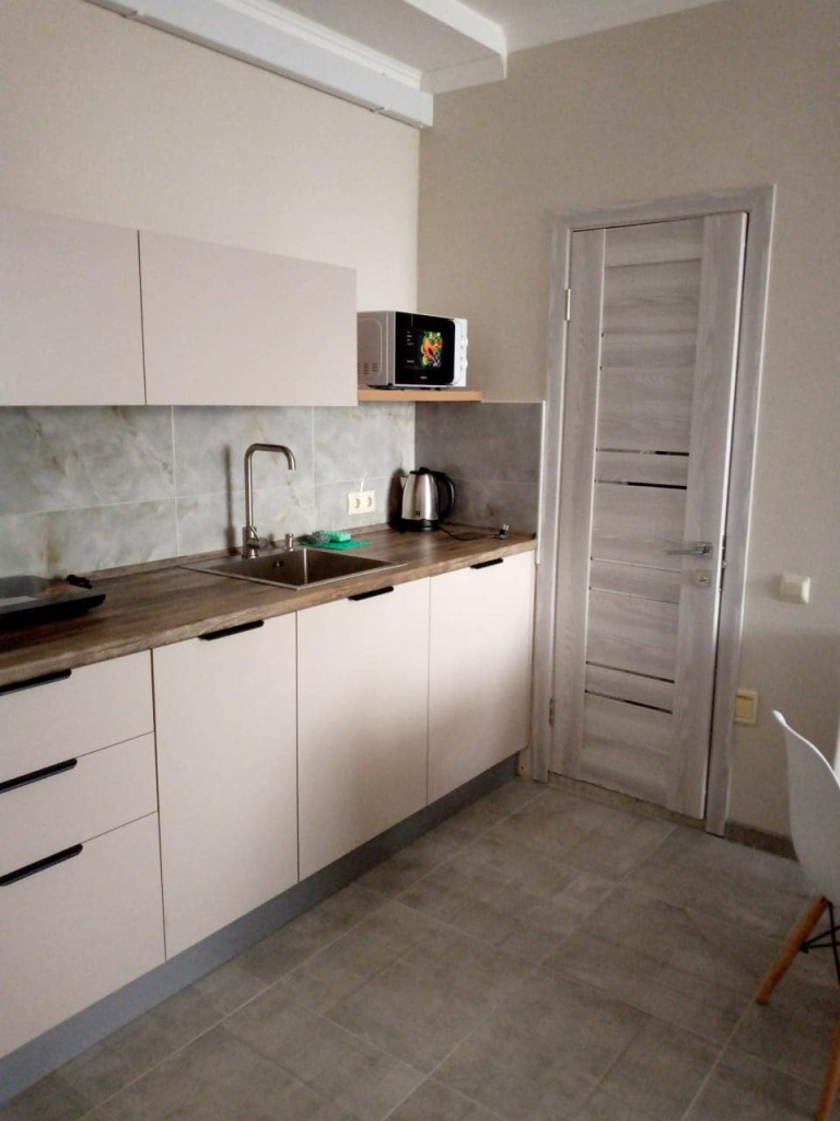Стандартный номер с кухней и отдельным входом: 1-комнатный номер, мебель, телевизор, кондиционер, холодильник, санузел, кухонная зона (чайник, плита), микроволновая печь, сейф, фен, 23 кв.м.