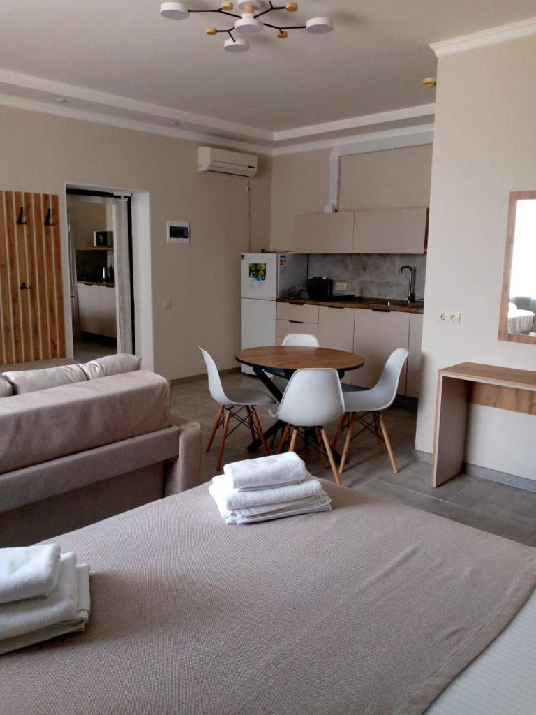 Улучшенный стандарт с отдельным входом и мини-кухней: 1-комнатный номер, мебель, телевизор, кондиционер, холодильник, санузел, кухонная зона (чайник, плита), микроволновая печь, сейф, фен.