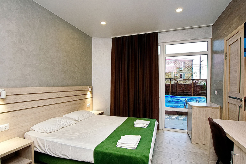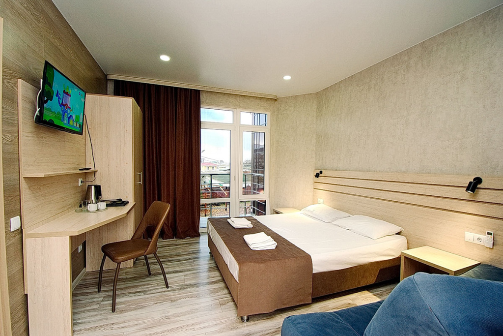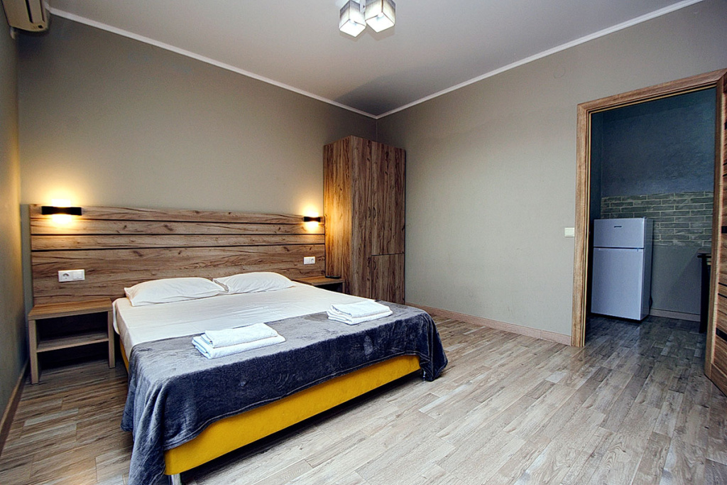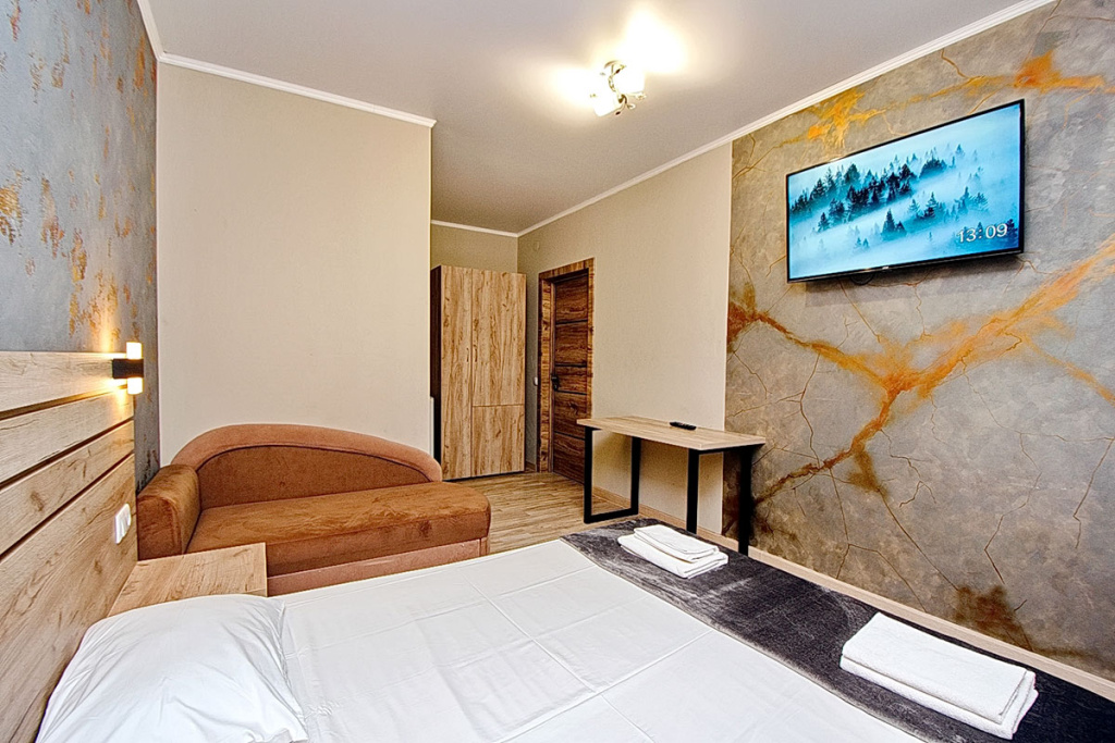 4-местный стандарт: 1-комнатный номер, мебель (2-спальная кровать и 2-спальный диван), телевизор, кондиционер, холодильник, санузел, фен, 18 м.кв.
