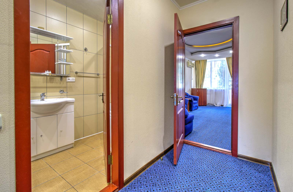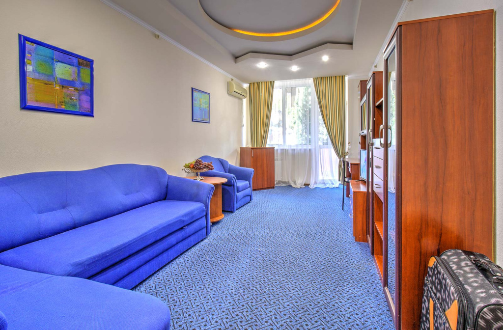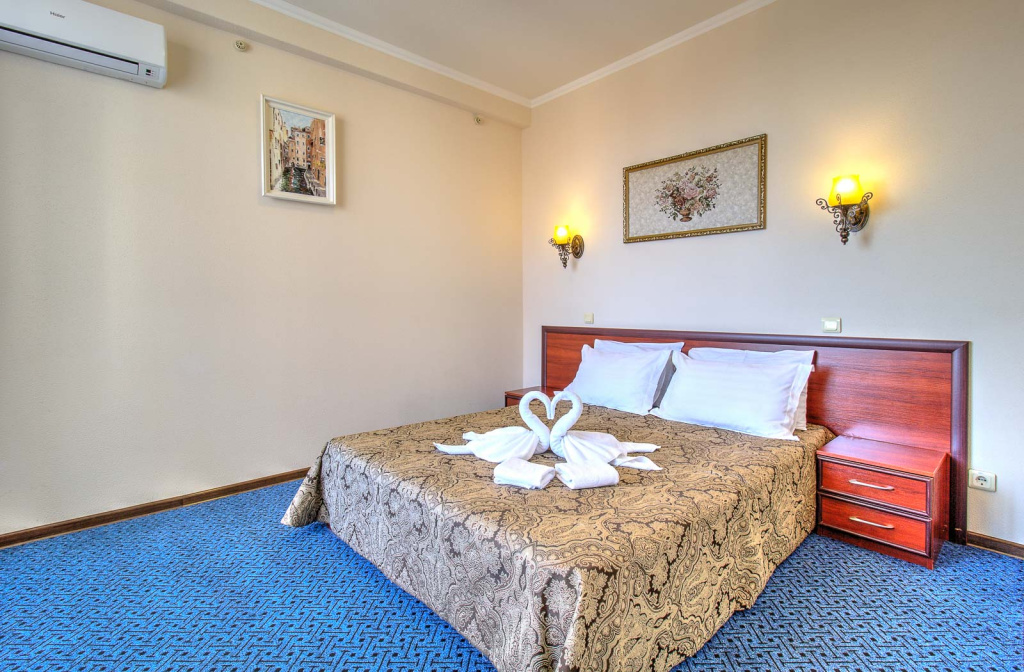 Стандарт Б вид на зеленую зону с балконом: 1-комнатный номер, мебель (2-спальная кровать или две 1-спальные кровати, доп.место - еврораскладушка), кондиционер, санузел, телевизор, холодильник, фен, чайник, 20 кв.м.,1 корпус, 2,4,5,6 этаж, без лифта.Люкс Б 2-комнатный вид на море с балконами: 2-комнатный номер, мебель (2-спальная кровать, доп.место - кресло-кровать), кондиционер, санузел, телевизор, холодильник, фен, чайник, 34 кв.м., 2 балкона, 1 корпус, 3 этаж, без лифта.