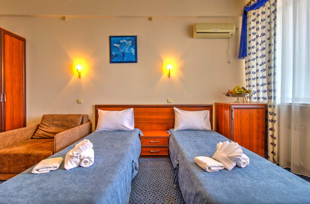 Стандарт вид на море с балконом: 1-комнатный номер, мебель (2-спальная кровать или две 1-спальные кровати, доп.место - кресло-кровать), кондиционер, санузел, телевизор, холодильник, фен, чайник, 1 корпус, 3,4,5,6 этаж, без лифта.