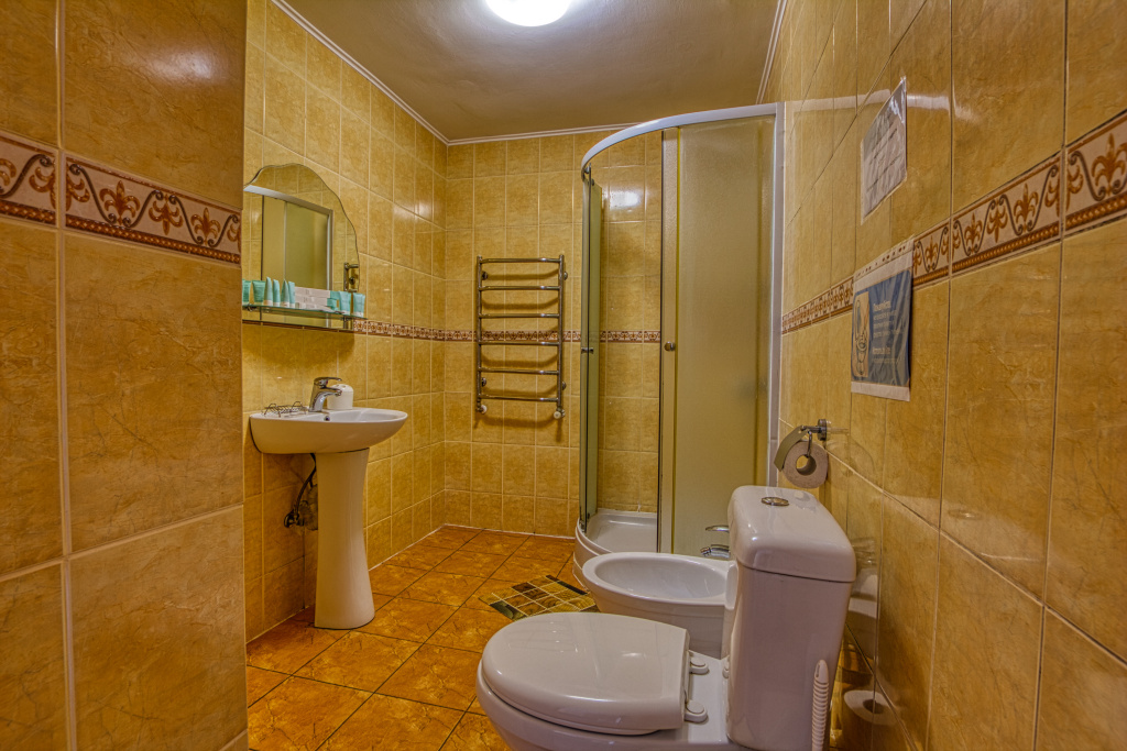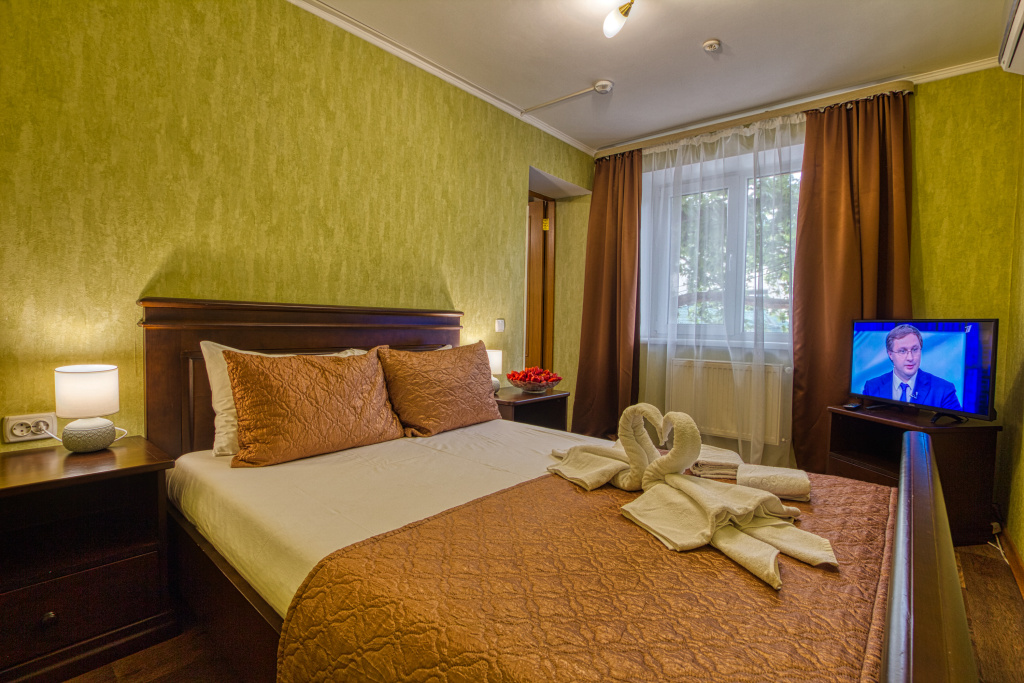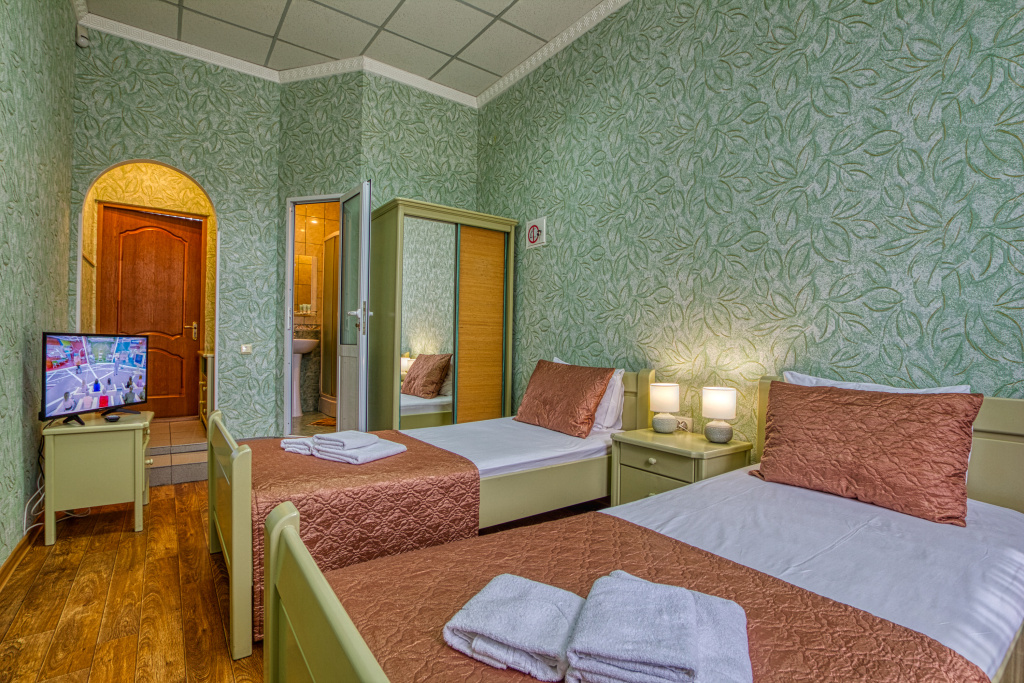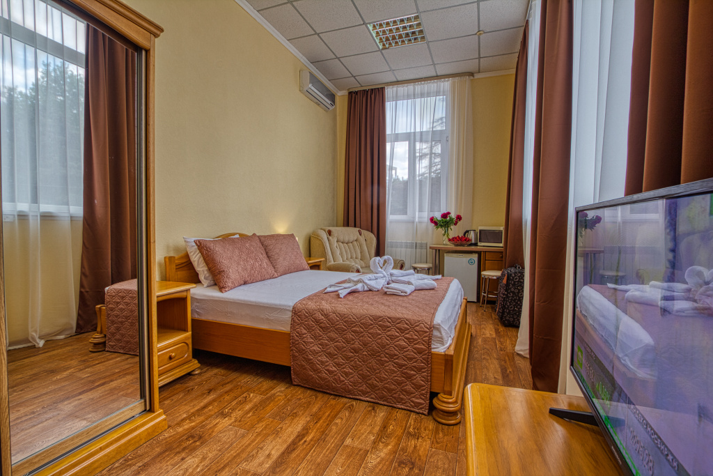 Стандарт: 1-комнатный номер, мебель (две 1-спальные кровати с возможностью их совмещения и раскладное кресло), кондиционер, санузел, телевизор, холодильник, 20 кв.м.