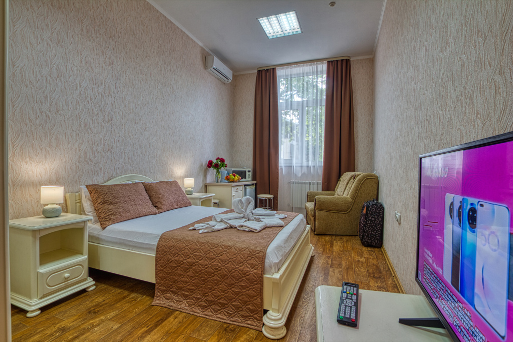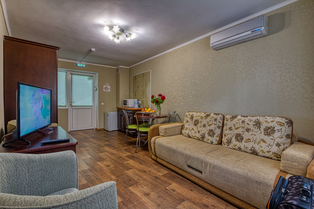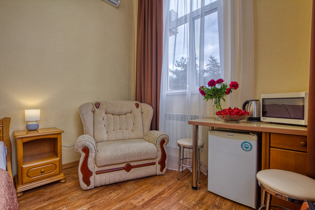 Комфорт: 1-комнатный номер, мебель (2-спальная кровать и раскладное кресло), кондиционер, санузел, телевизор, холодильник, 21,5 кв.м.